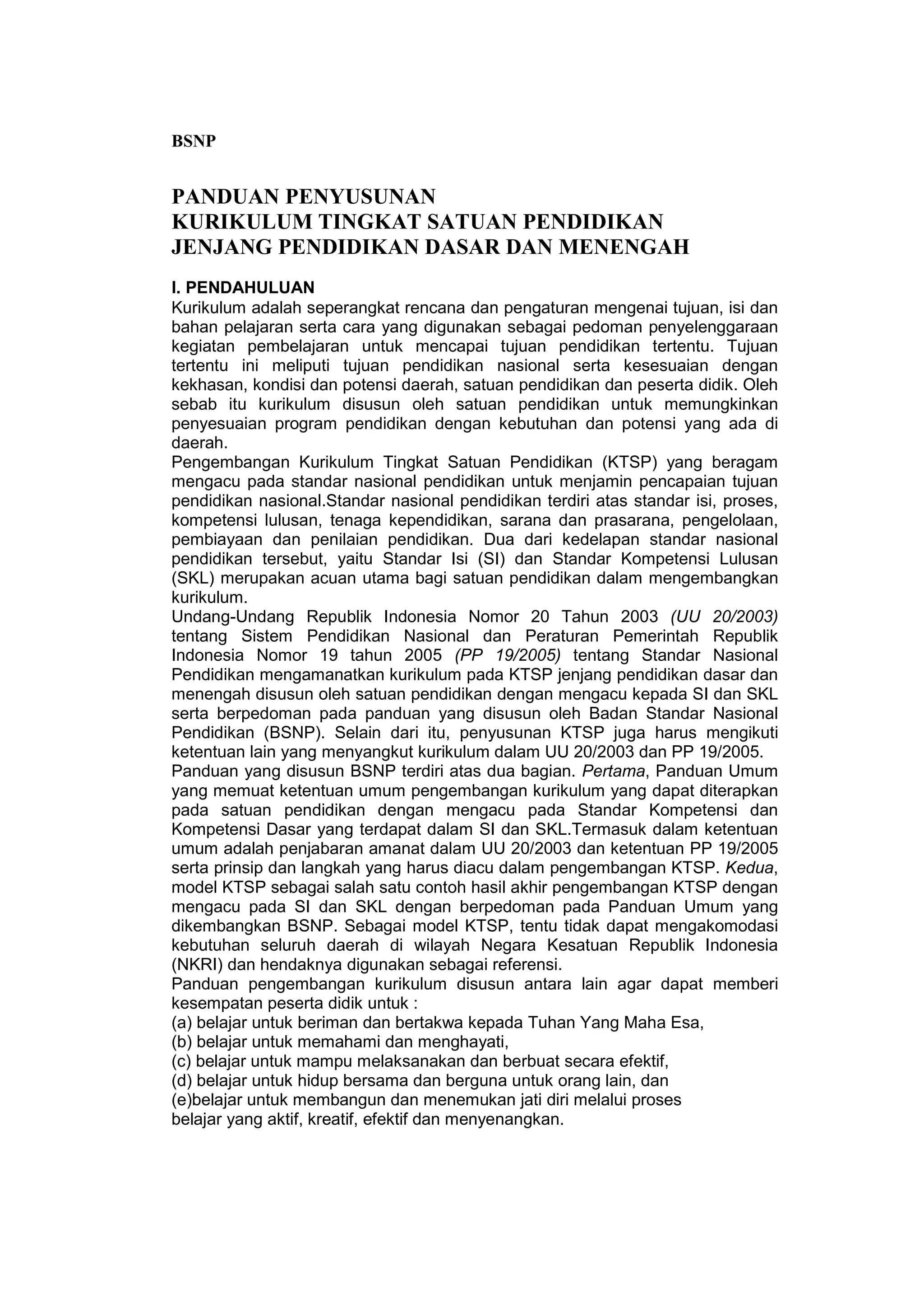 Panduan ini memberikan panduan bagi satuan pendidikan dalam menyusun kurikulum tingkat satuan pendidikan (KTSP) dengan memperhatikan standar nasional pendidikan dan prinsip-prinsip pengembangan kurikulum. KTSP harus disusun sesuai dengan potensi daerah dan peserta didik serta tuntutan perkembangan ilmu pengetahuan dan dunia kerja.