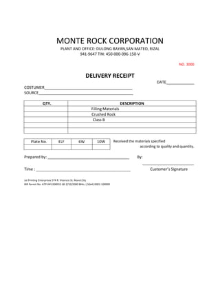 Monte Rock Corporation delivered filling materials and crushed rock to a customer. The delivery receipt specified the materials, including crushed rock and filling materials. It also included details like the customer, source, plate number of the delivery truck, and signatures to acknowledge receipt of the materials according to quality and quantity.