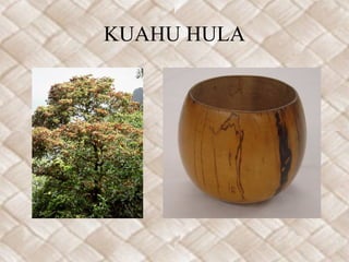 The document provides information about plants used in traditional Hawaiian hula kuahu ceremonies and altars. It lists common plants like halapepe, ieie, maile, ohi'a lehua, and palapalai. It also mentions other plants like ilima, koa and pili. The document includes the lyrics of a traditional mele kuahu song dedicated to the Hawaiian god Laka, asking him to protect and return to his altar.