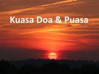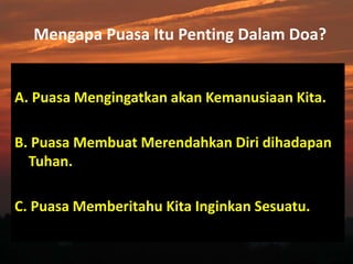 Dokumen ini membahas pentingnya puasa dalam doa, mengingatkan akan kemanusiaan dan kerendahan hati di hadapan Tuhan. Dalam konteks ini, sebuah peristiwa ketika Yesus menyembuhkan seorang anak yang sakit ayan menjadi contoh bagaimana iman dan doa diperlukan untuk mengatasi tantangan. Yesus mengarahkan murid-muridnya bahwa puasa dan doa diperlukan untuk mengusir setan dari anak tersebut.