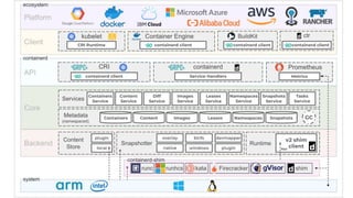 The KubeCon EU 2020 presentation by Akihiro Suda and Wei Fu provides an in-depth overview of containerd, a mid-level container runtime that sits between lower-level runtimes like runc and higher-level platforms like Docker and Kubernetes. Key features include custom runtime and snapshotter plugins, lazy image pulling improvements like stargz and estargz for enhanced efficiency, along with better support for rootless operation and cgroup v2. Upcoming features in v1.4 aim to improve resource limitation, integration with external plugins, and support for runtime v2 APIs.