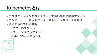 Kubernetesとは • アプリケーションをコンテナー上で良い感じに動かすツール • コンピュート、ネットワーク、ストレージリソースを提供 •