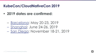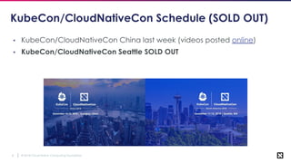 The document outlines various topics related to Kubernetes and cloud-native computing, including upcoming events, educational workshops, and new features in Kubernetes versions 1.12 and 1.13. It discusses advancements in the Container Runtime Interface (CRI), scheduling enhancements, and storage solutions through the Rook project. Additionally, it highlights security tools like Falco for runtime protection and mentions community engagement through meetups and sponsorship opportunities.