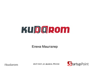 Документ описывает бизнес-модель и стратегию компании Kudarom, занимающейся онлайн-бронированием средств размещения в России и Украине. Компания имеет более 250 объектов и подтвержденную B2C модель с транзакционной монетизацией. Команда состоит из опытных специалистов в области туризма и электронной коммерции, и она ищет дополнительные инвестиции для дальнейшего развития.