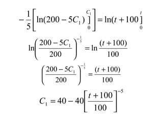 Dokumen ini membahas metode integrasi grafis dan analitis dalam perhitungan integral untuk berbagai aplikasi dalam operasi unit, seperti menghitung suhu reaktor dan pengendalian proses. Pembahasan juga mencakup neraca massa, hukum kekekalan massa, dan pemodelan matematis untuk proses pencampuran serta distilasi. Contoh konkret dari perhitungan campuran asam dan konsentrasi larutan ditunjukkan untuk ilustrasi penerapan teori.