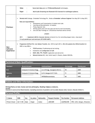 The document contains the resume of Kuldeep Kumar, who has 3.8 years of experience as a senior software engineer developing embedded software using Linux and Windows. His skills include programming in C, working with RTOS like MQX and FreeRTOS, Bluetooth communication, and developing firmware for microcontrollers. He is currently working at Samsung R&D Institute India developing and maintaining HAL components for audio video products.
