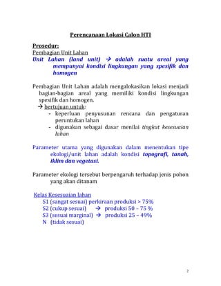 Dokumen tersebut membahas tentang pemilihan jenis pohon dan kesesuaian lokasi untuk hutan tanaman. Faktor-faktor yang perlu diperhatikan dalam pemilihan jenis pohon dan lokasi antara lain kondisi iklim, tanah, topografi, dan faktor biotik di lokasi. Jenis pohon harus sesuai dengan tujuan budidaya serta karakteristik lingkungan lokasi untuk mendapatkan pertumbuhan dan produksi yang optimal.