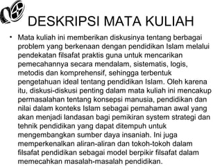 Mata kuliah Filsafat Pendidikan ini membahas permasalahan pendidikan Islam melalui pendekatan filsafat praktis, bertujuan untuk melatih mahasiswa berpikir logis dan sistematis. Topik inti mencakup konsepsi manusia, nilai, dan berbagai aliran filsafat pendidikan untuk mengembangkan sumber daya insaniah. Metode pembelajaran menggunakan diskusi dan evaluasi melalui tes lisan, tulisan, dan studi kasus.