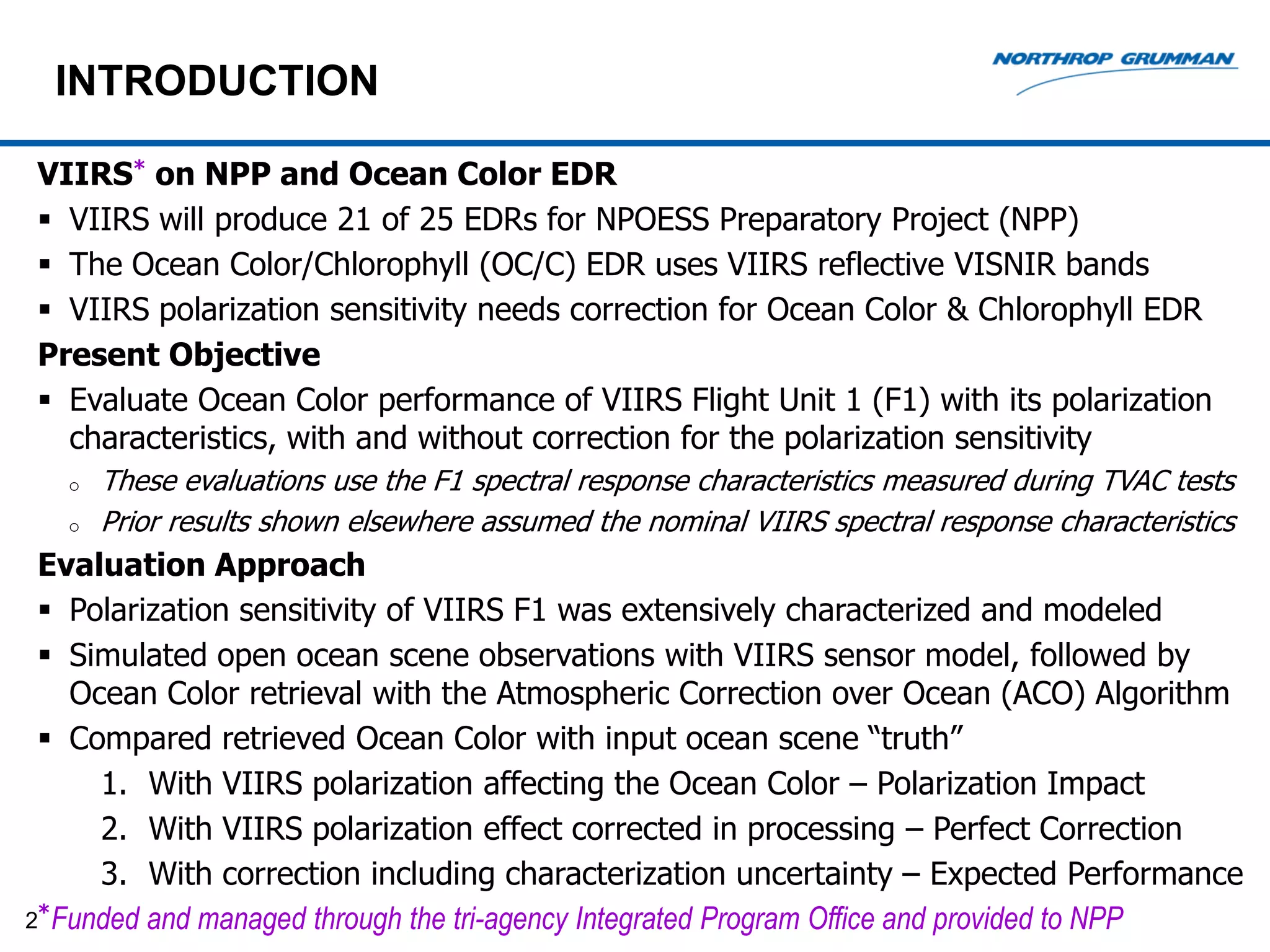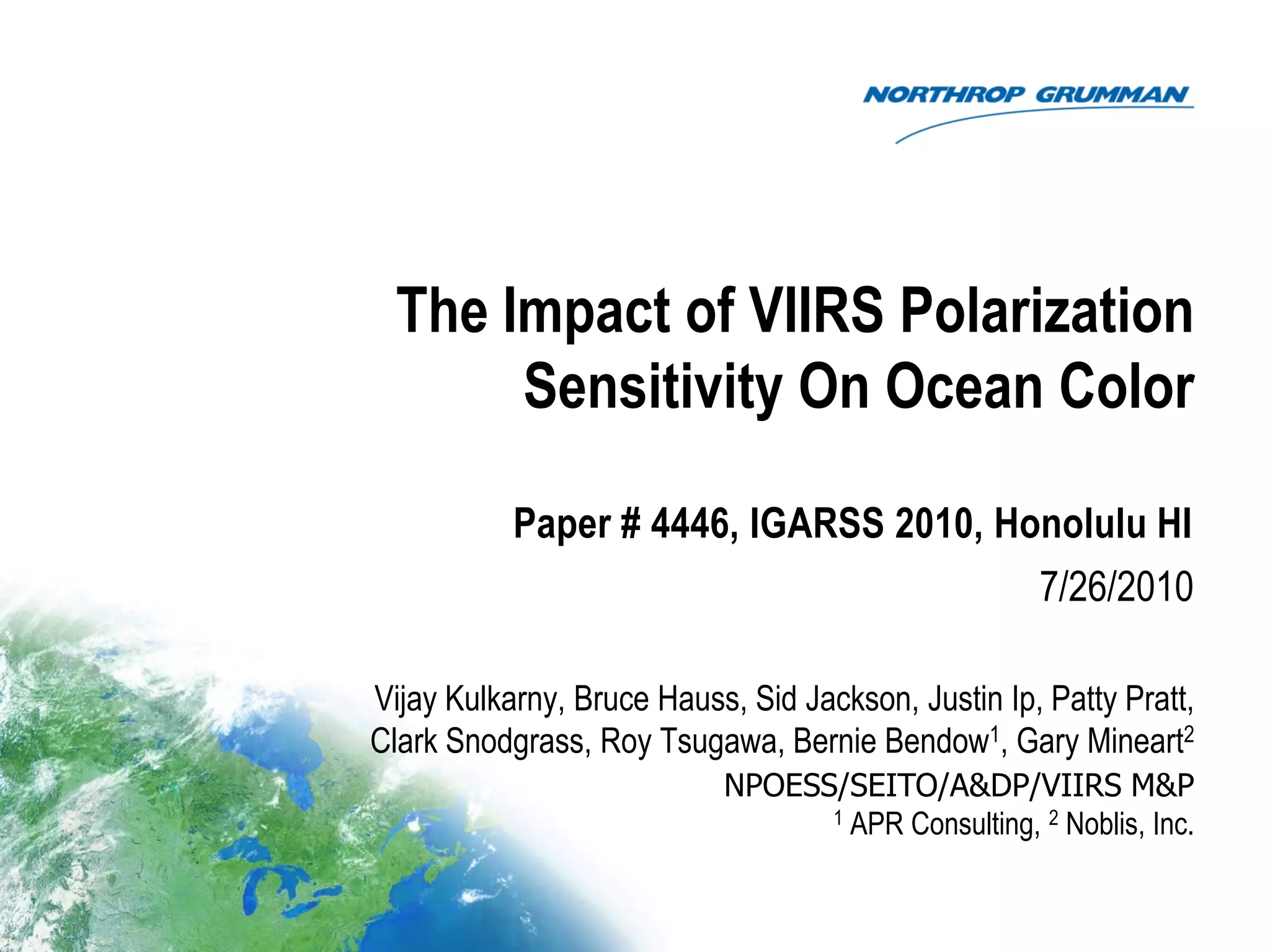 The document discusses the impact of polarization sensitivity on ocean color measurements by the Visible Infrared Imaging Radiometer Suite (VIIRS) instrument. Extensive testing characterized VIIRS's polarization sensitivity, which varies by band and detector. Left uncorrected, polarization effects could cause errors in retrieved water leaving radiance (nLw) used for ocean color products. Simulations show polarization correction in processing reduces nLw errors significantly, while uncertainty in sensor characterization has a small additional impact. Updating algorithms with polarization correction and detector-dependent calibration is needed to achieve ocean color performance comparable to legacy sensors.