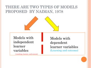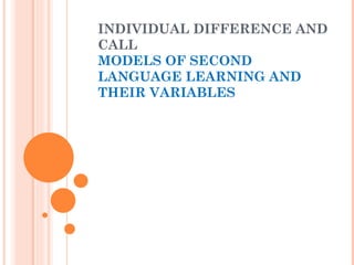 There are two main models of second language learning proposed by Naiman in 1978: models with independent learner variables and models with dependent learner variables. The good language learner model identifies factors such as age, intelligence, aptitude, and motivation that influence the learner. Monitor theory proposes that factors like affective filter, input, and output impact language learning. Situational variables also affect language choice and use according to Brown and Fraser's framework. Later models by scholars like Skehan and Spolsky further explored how individual differences, social and environmental factors influence second language acquisition.
