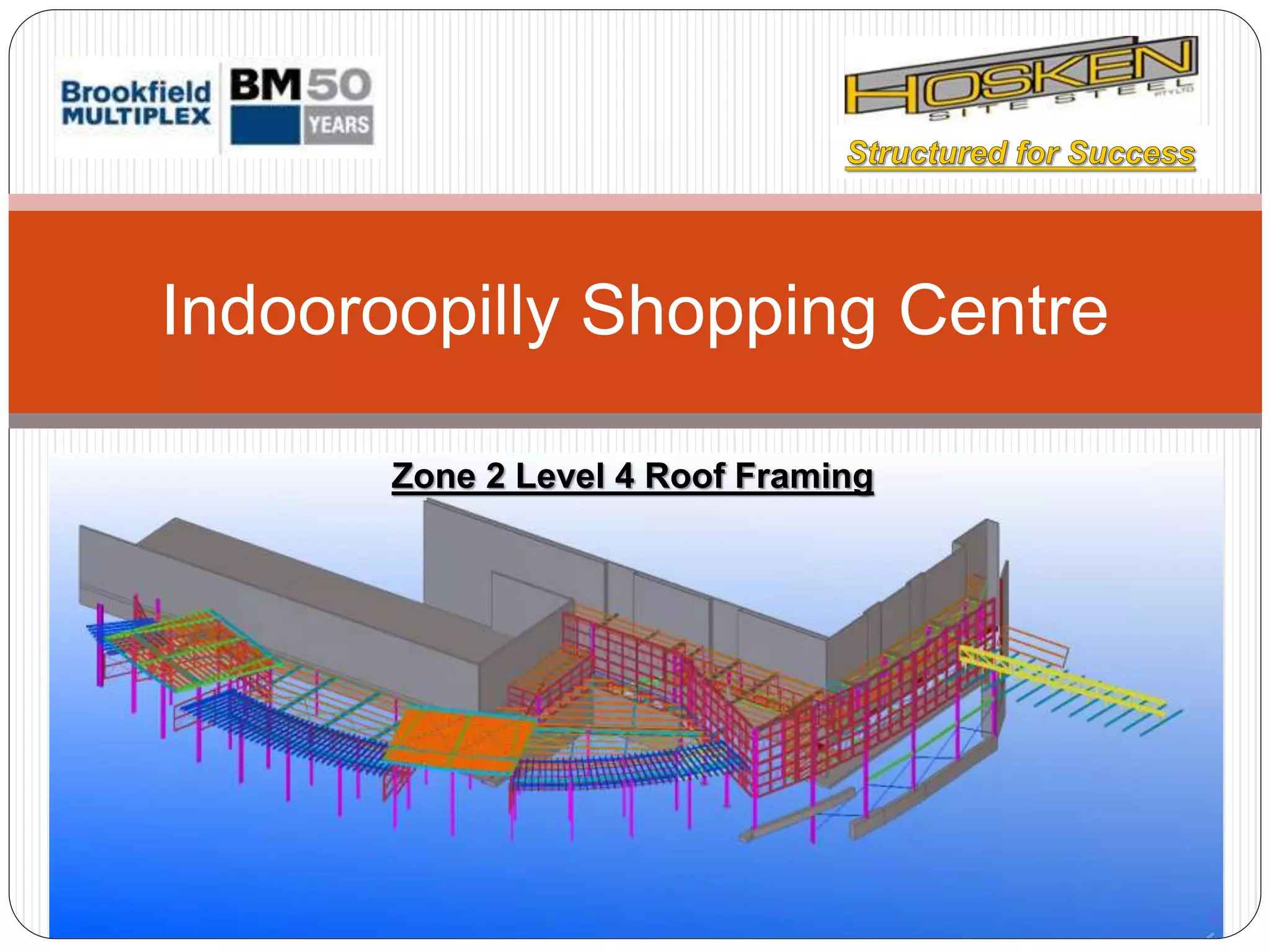 The document outlines the erection sequence for roof framing at the Indooroopilly Shopping Centre in multiple steps. It involves installing columns, beams, rafters, purlins, trusses, and other framing members using cranes in a specific lift sequence to construct the roof framing from the ground up. Temporary bracing is also installed as needed during construction. Dimensions and weights of individual frame assemblies are provided.