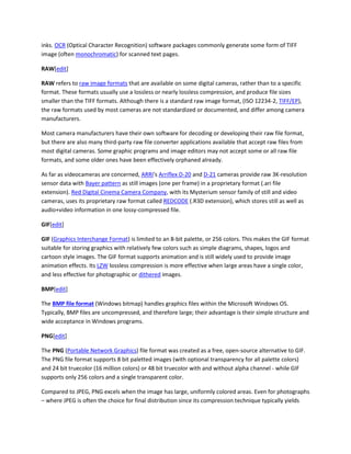 The document discusses various image file formats including JPEG, JPEG 2000, Exif, TIFF, RAW, GIF, BMP, PNG, PPM/PGM/PBM, WEBP, HDR formats, and vector formats like CGM. It describes the key features and uses of each format, such as JPEG being a common format for photographs that uses lossy compression, while PNG supports lossless compression and transparency and is better for images with large uniform areas.