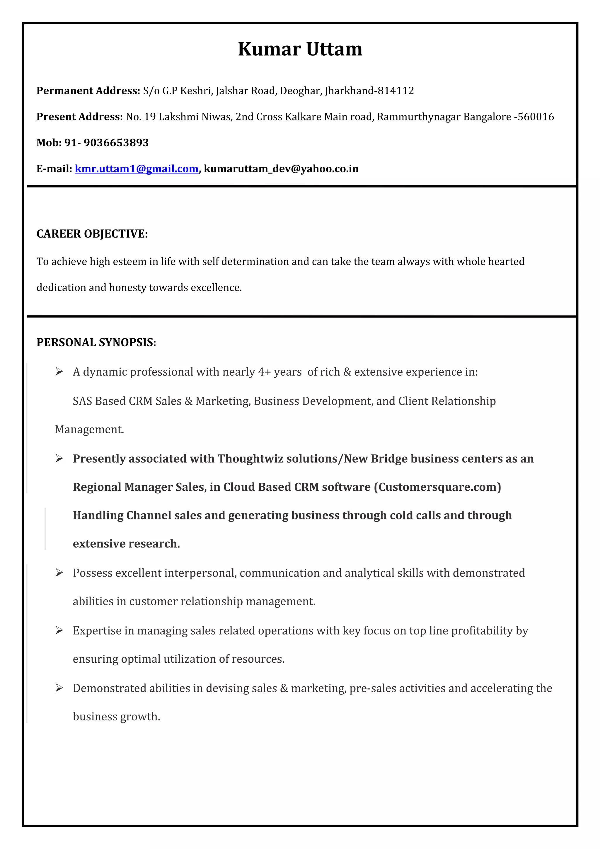 This document contains the resume of Kumar Uttam. It summarizes his personal details, education history, work experience, skills, and achievements. Currently he works as a Regional Manager for Thoughtwiz Solutions, where he is responsible for sales, client relationships, and software demonstrations. He has over 4 years of experience in CRM sales, marketing and business development. His skills include communication, Microsoft Office, and working well in groups. He holds an MBA and BBM from colleges in Bangalore.