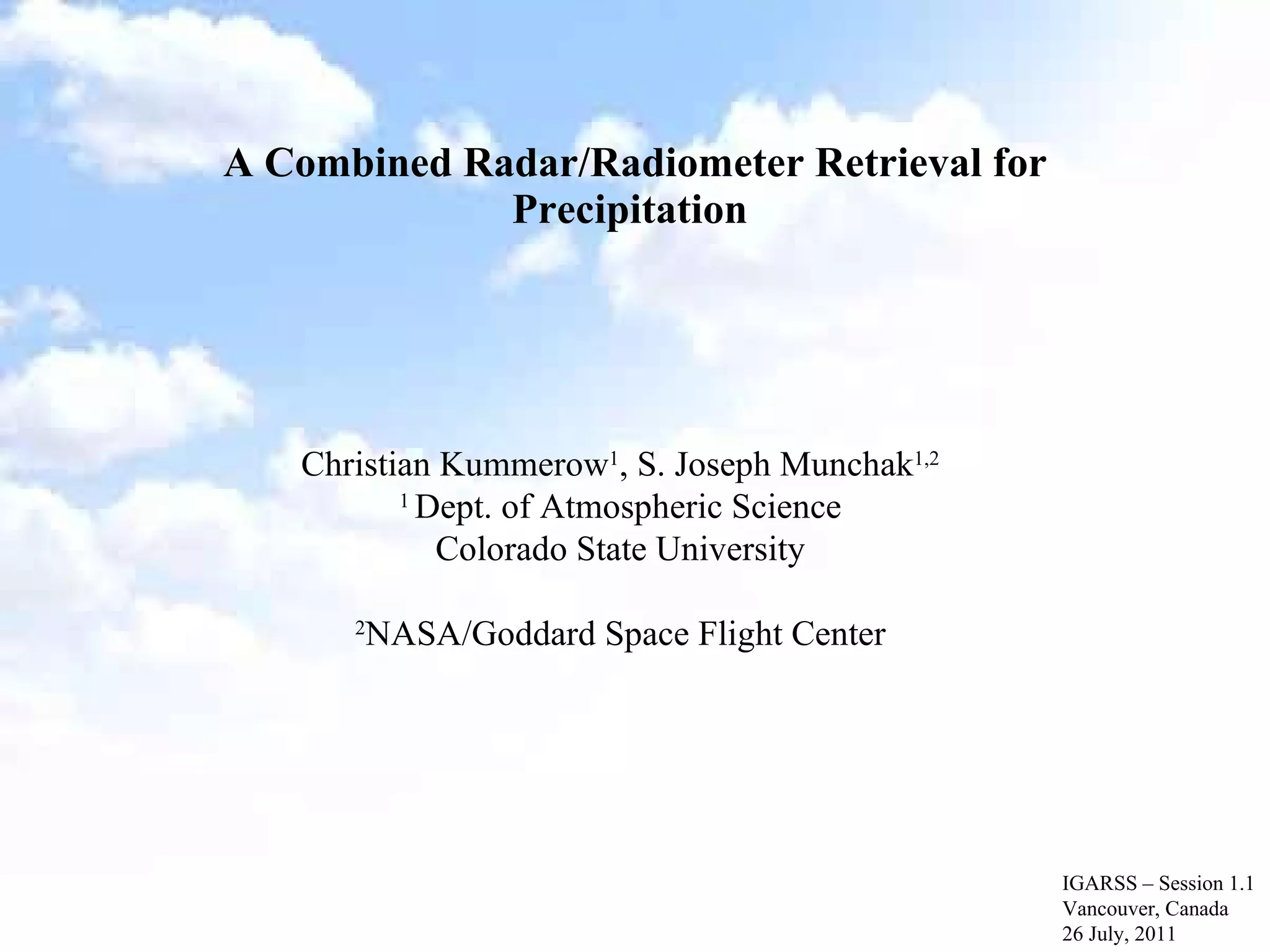 The document describes a new combined radar/radiometer algorithm for retrieving precipitation from TRMM measurements. It builds on existing single-sensor algorithms by using a variational approach to minimize errors between modeled and observed radar reflectivity and brightness temperatures. Key assumptions about rain drop size distribution, ice properties, and cloud water can be adjusted within the model as retrieval parameters to improve the match with observations globally. The goal is to develop a physically consistent algorithm that leverages all available sensor data to improve precipitation estimates compared to either radar-only or radiometer-only products.