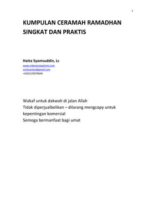 1. Dokumen ini berisi dua materi ceramah Ramadhan yang membahas tentang gembira menyambut Ramadhan dan kunci sukses Ramadhan.
