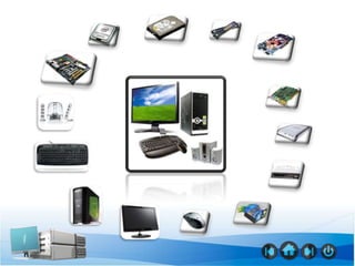 This document provides a list of common computer hardware components including the mainboard, CPU, hard disk, RAM, VGA, sound card, CD-ROM, card reader, power supply, mouse, monitor, case, keyboard, speaker, and multimedia components. It describes the basic internal and external parts that make up a typical computer system.