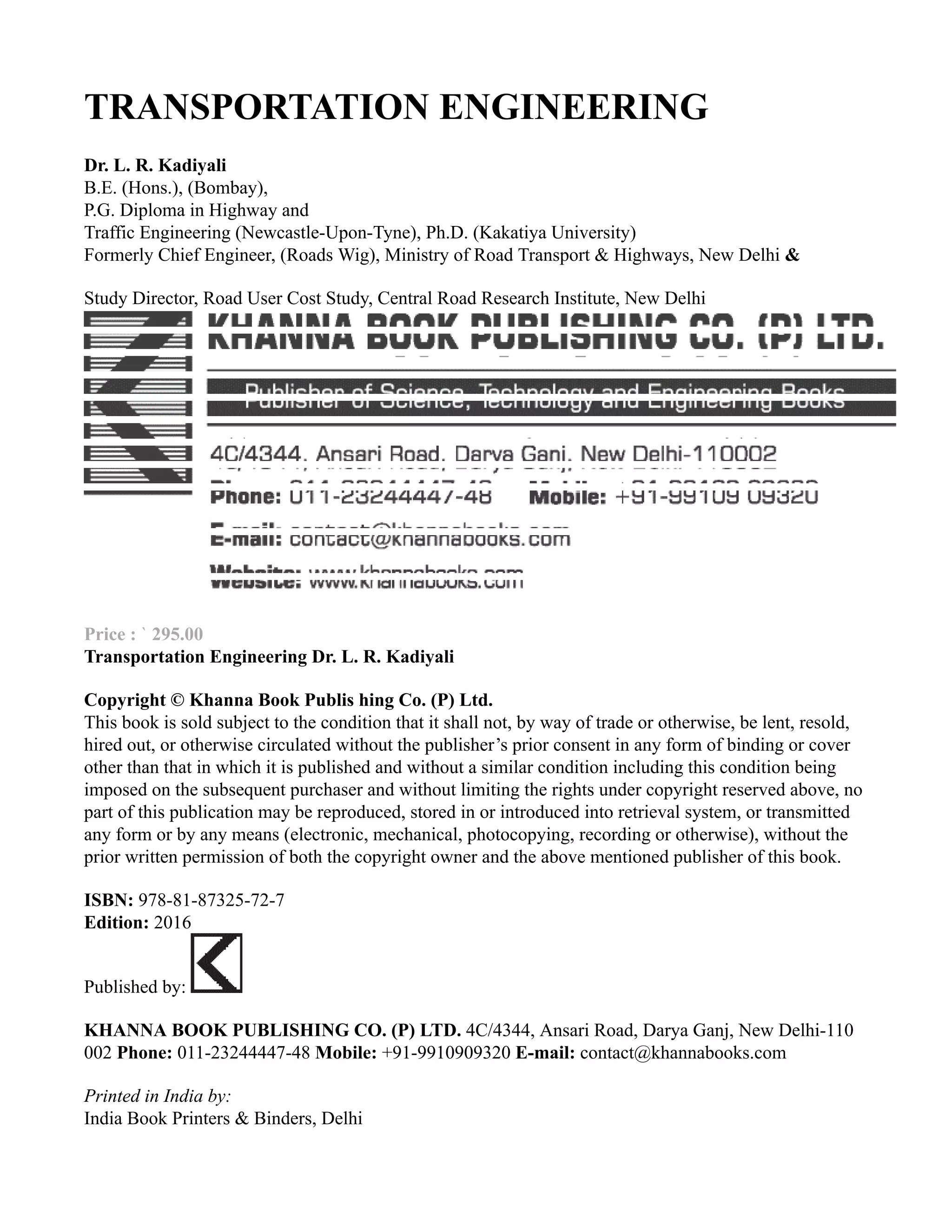 This document provides an overview of the book "Transportation Engineering" by Dr. L. R. Kadiyali. It includes information about the author's qualifications and experience. The preface outlines some of the key issues addressed in the book, such as deficiencies in India's transportation system and how engineering students can help overcome problems in their careers. The book is divided into multiple sections covering topics such as transportation systems and planning, highway engineering, and pavement design and construction. It aims to provide engineering students with knowledge of transportation problems in India and potential solutions.