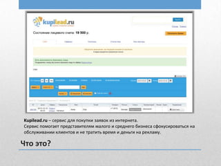 Kupilead.ru is a service that facilitates the purchase of online leads, assisting small and medium businesses in customer service while minimizing advertising costs. The platform uses an auction system to distribute leads among users, focusing on various sectors such as insurance, tourism, English courses, and legal consultations, aiming to expand to 60 sectors. The document highlights the significant potential of the lead generation market in Russia, projecting substantial growth in internet advertising revenues.
