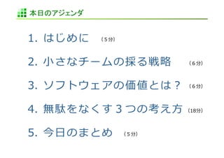 スクーの授業で使った資料です。 ソフトウェア開発をしていく中で、沢山のリソースやお金をつぎ込んで開発するのではなく、どうすれば少人数のチームで低コストな中で開発を続けていくことで、大きな成果を出す為の考えかたについて説明しています。