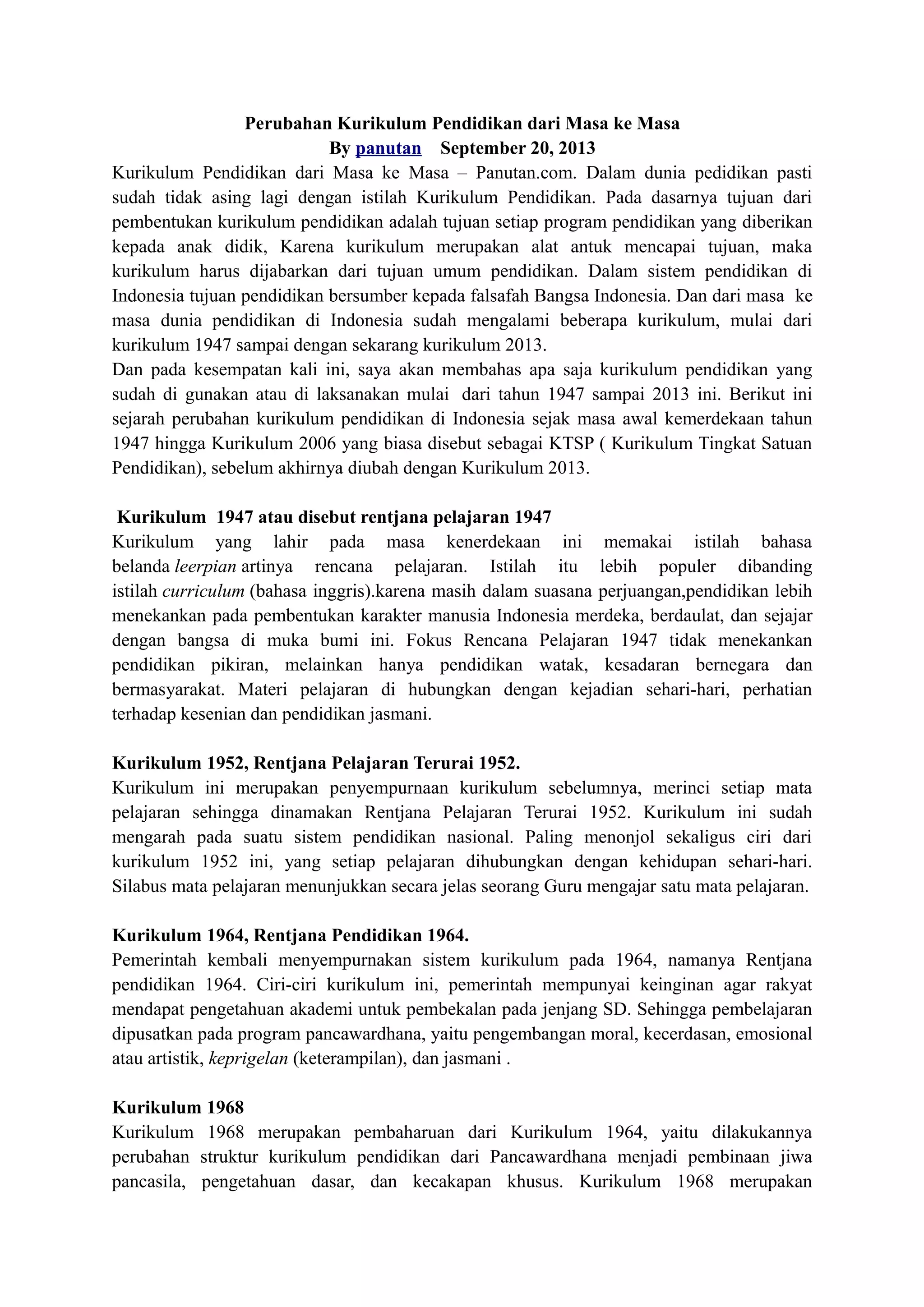 Dokumen ini menjelaskan evolusi kurikulum pendidikan di Indonesia dari tahun 1947 hingga 2013, mencakup berbagai perubahan dan tujuan masing-masing kurikulum yang dipengaruhi oleh konteks politik, sosial, dan budaya. Perubahan kurikulum menunjukkan penyesuaian terhadap kebutuhan masyarakat dan peningkatan kualitas pendidikan, mulai dari penekanan pada karakter hingga pendekatan berbasis kompetensi. Setiap kurikulum memiliki karakteristik dan sasaran tertentu untuk mencapai tujuan pendidikan yang diinginkan.