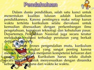 Kurikulum pendidikan merupakan kunci untuk menentukan kualitas lulusan dan harus dievaluasi secara berkala untuk disesuaikan dengan perkembangan ilmu pengetahuan dan kebutuhan pasar. Kurikulum 1994, sebagai penyempurnaan dari kurikulum sebelumnya, menekankan keaktifan siswa dalam proses pembelajaran serta berorientasi pada tujuan pendidikan yang lebih relevan dengan perkembangan zaman. Meskipun terdapat beberapa kelemahan seperti beban belajar yang berat, kurikulum ini bertujuan untuk meningkatkan mutu pendidikan dan mempersiapkan siswa untuk melanjutkan pendidikan ke jenjang yang lebih tinggi.