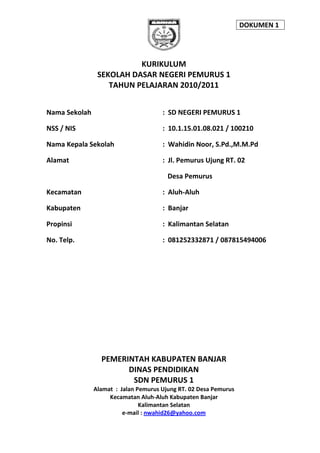 Kurikulum ini mengatur mata pelajaran, muatan lokal, dan kegiatan pengembangan diri peserta didik SDN Pemurus 1 dengan mempertimbangkan tujuan pendidikan nasional, potensi peserta didik, dan kondisi sekolah dan daerah. Kurikulum ini bertujuan untuk membekali peserta didik dengan pengalaman belajar yang sesuai dengan minat dan bak