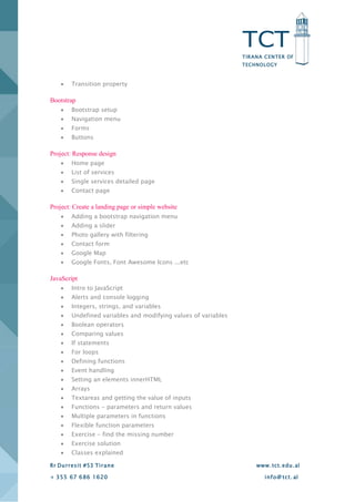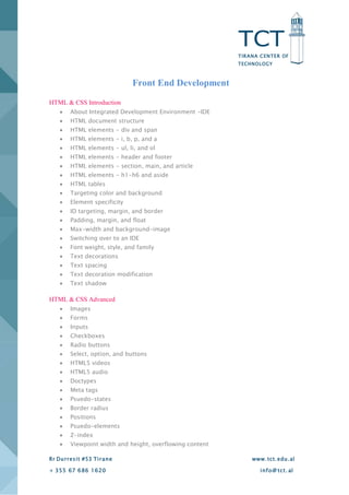 This document outlines the course content for a Front End Development program offered by Tirana Center of Technology (TCT) in Tirane, Albania. The program covers HTML & CSS, Bootstrap, JavaScript, and building projects. HTML & CSS topics include elements, tables, colors, fonts, forms, and positioning. Bootstrap covers setup, navigation menus and forms. JavaScript topics include variables, functions, arrays, and classes. Students will build projects like a landing page, photo gallery, and application using these skills. The program aims to provide skills to create responsive websites and applications. It is led by Rezart Alija, TCT's Executive Director.
