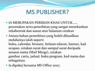 Dokumen ini memberikan ringkasan tentang kursus MS Publisher 2007. Ia menjelaskan fitur-fitur utama perisian tersebut seperti objek, template, dan mail merge. Prinsip-prinsip desain CASPER yaitu kontrast, penyusunan, proksimiti, repetisi, dan warna juga dibahas untuk membantu pengguna membuat penerbitan yang efektif. Pelajar diajak untuk mempertimbangkan unsur-unsur tersebut dalam membuat penerbitan.