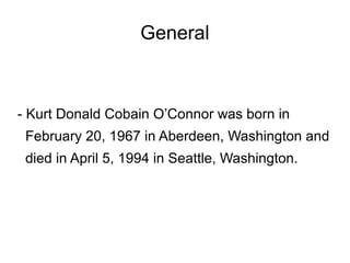 Kurt Cobain was the lead singer and guitarist of the seminal grunge band Nirvana. He was born in 1967 in Washington and formed Nirvana in the late 1980s, achieving massive mainstream success with their 1991 album Nevermind and single "Smells Like Teen Spirit," which marked a shift in popular music. Cobain struggled with addiction and health issues throughout his life and career. He died by suicide in 1994 at his home in Seattle at the age of 27.
