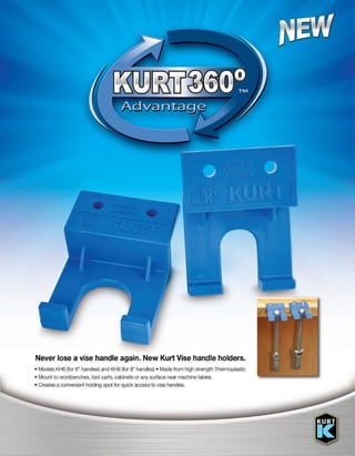 Kurt vise handle holders are available in both 6 " and 8 " models. The can be mounted to any surface using the two thru holes on back of the unit. They are made of a high impact material the will last. Branded with the KURT name and made in the U.S.A. - http://kurtworkholding.com