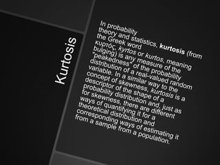 The document provides a frequency table with data missing for calculating the kurtosis of a distribution. To summarize, it asks the reader to fill in the missing data in the frequency table, then calculate the kurtosis to determine if the distribution is leptokurtic (peaked more than normal), mesokurtic (normal peakedness), or platykurtic (flatter than normal).