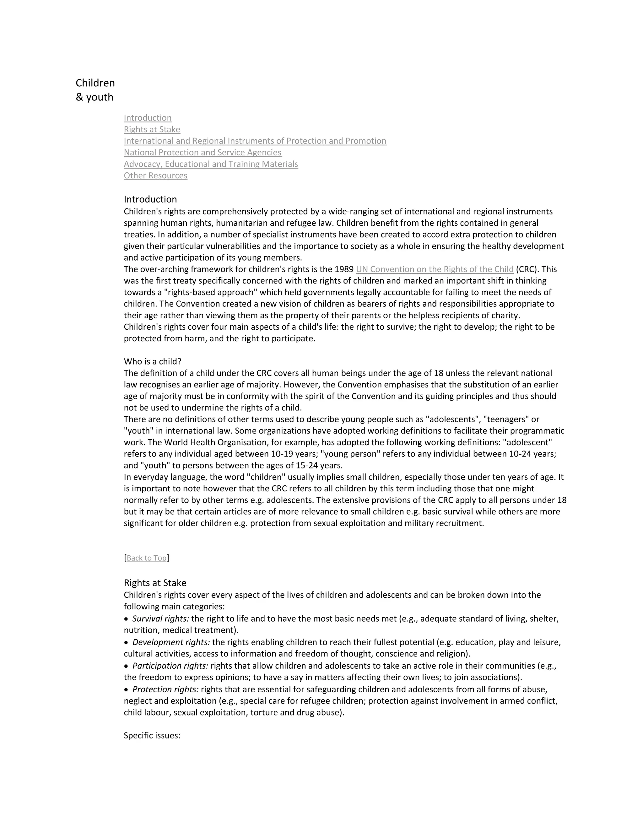 The document discusses children's rights under international law. It begins by introducing the UN Convention on the Rights of the Child (CRC) as the overarching framework that establishes children as bearers of rights. The CRC covers four aspects of a child's life: survival, development, protection, and participation. It defines a child as anyone under 18. The document then outlines some key rights children have, such as rights relating to labor exploitation, sexual exploitation, military recruitment, and juvenile justice. It emphasizes three guiding principles for implementing children's rights: considering the best interests of the child, non-discrimination, and participation. The document concludes by mentioning some international organizations that work to protect children's rights, such as UNICEF