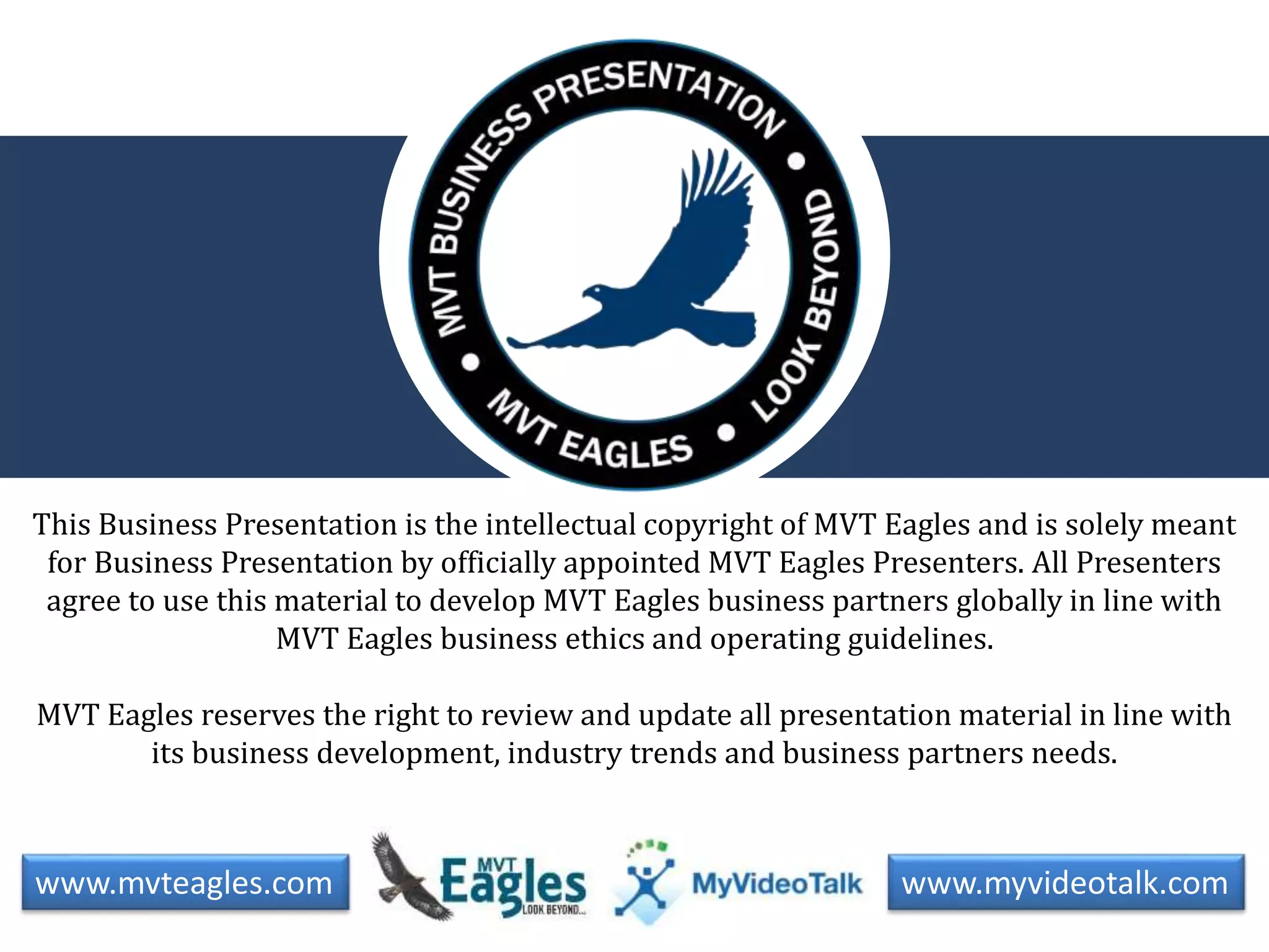 This presentation summarizes a business opportunity with MVT Eagles, which distributes video technology products through a direct selling model. The presentation outlines the company and products, which include video design, broadcasting, and channel tools. It then describes the compensation plan, including bonuses and a binary structure allowing individuals to earn through building two teams. Finally, it emphasizes the importance of acting quickly to benefit from the business's growth and duplication.