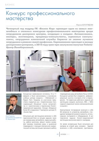 Конкурс профессионального мастерства среди сотрудников дилерских центров холдинга 'Бизнес Кар' прошел 10 и 11 февраля, объединив более 80 участников, которые соревновались в теоретических и практических заданиях, включая сварку и окраску автомобилей. В соревнованиях определяли лучших жестянщиков, маляров, автомехаников и консультантов, где победители получали призы и награды. Гран-при конкурса был вручён команде 'Тойота Центр Левобережный', а оценивающая комиссия состояла как из внутренних специалистов, так и из независимых экспертов.