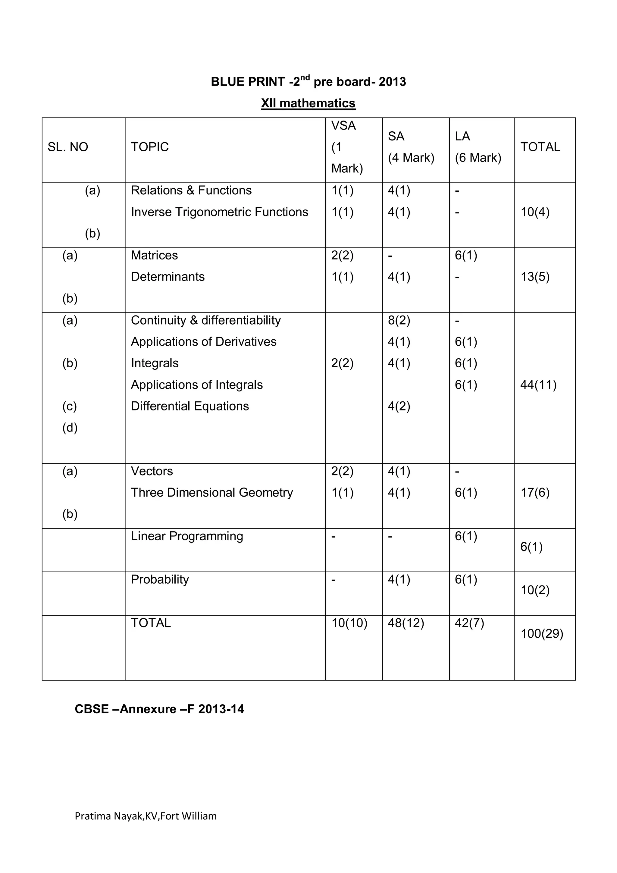 This document provides a blueprint for the topics and questions that will be covered on a 12th grade mathematics pre-board exam. It lists the topics that will be covered in short answer (SA), long answer (LA), and very short answer (VSA) questions. The topics include relations and functions, matrices, determinants, continuity and differentiability, applications of derivatives, integrals, differential equations, vectors, and three dimensional geometry. It provides the number of questions at each mark value (1, 4, 6) for each topic. In total there will be 10 VSA questions worth 1 mark each, 12 SA questions worth 4 marks each, and 7 LA questions worth 6 marks each, for a total of 100 marks