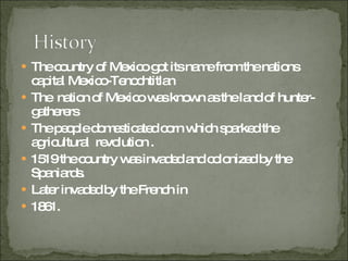 Mexico got its name from its capital Mexico-Tenochtitlan. The indigenous people of Mexico were hunter-gatherers who later domesticated corn, sparking an agricultural revolution. In the 1500s, Mexico was invaded by Spain and later France in the 1800s, resulting in many indigenous deaths and Mexico gaining independence from Spain in 1821 after wars for independence. Mexico has over 92 million people, with two-thirds living in cities and the rest in rural areas. Approximately 6.7% of Mexicans speak indigenous languages today.
