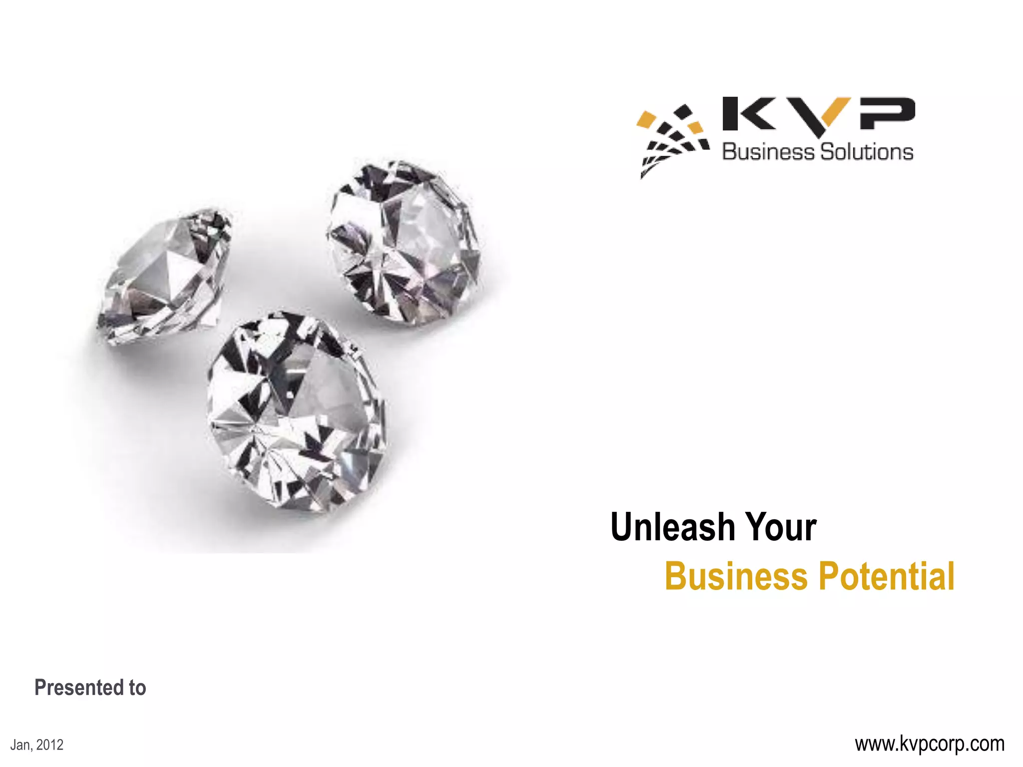 The document discusses KVP Corp and its business philosophy, facts, and services. KVP aims to help businesses grow using a social enterprise framework. It focuses on 5 industry verticals and has served over 60 customers. KVP's solution framework takes a phased approach moving from initial rollout to fully utilizing its enterprise cloud computing platform. The platform provides project management, collaboration, HR management and other tools. KVP aims to make businesses smarter by focusing on customers and communities.