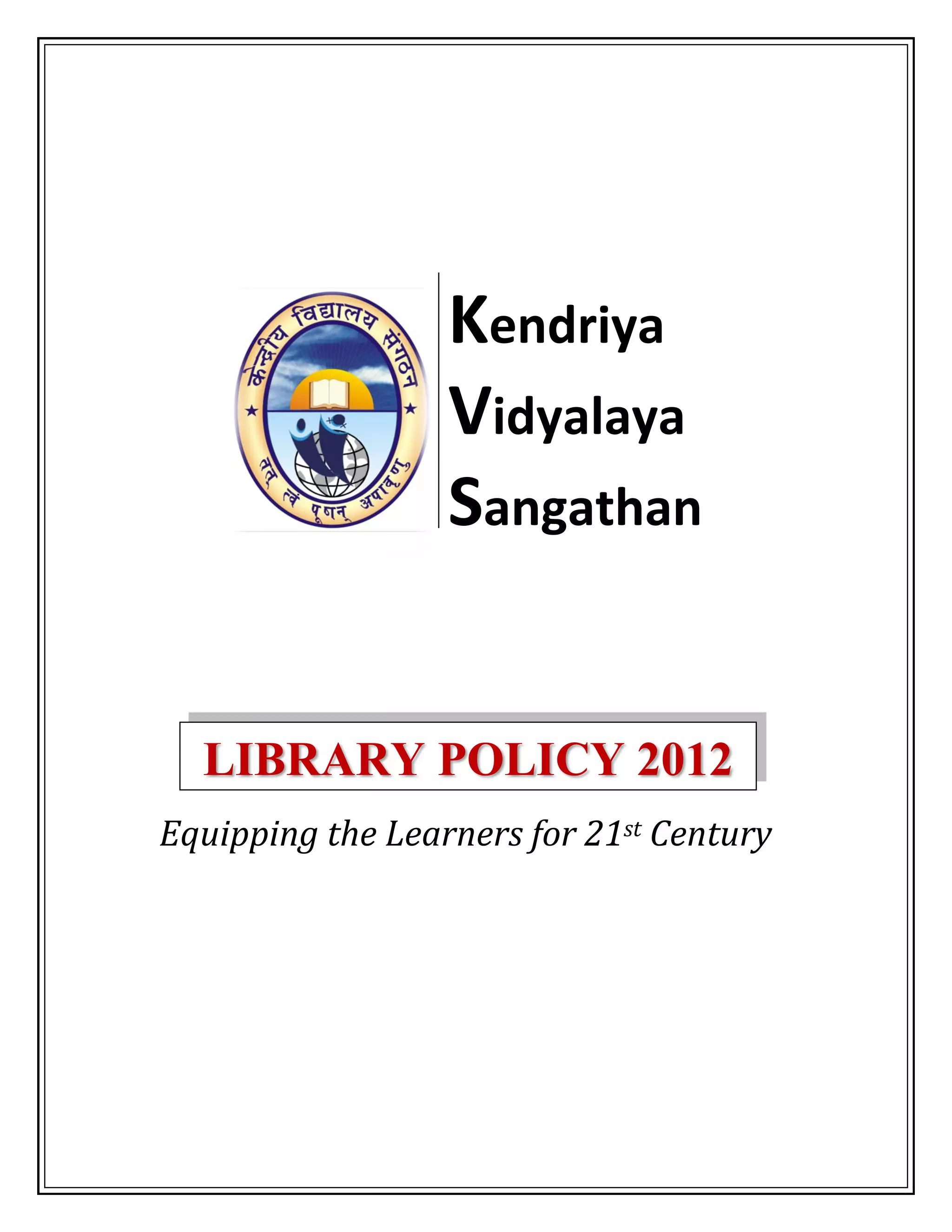 The document outlines the library policy of Kendriya Vidyalaya Sangathan. Some key points: