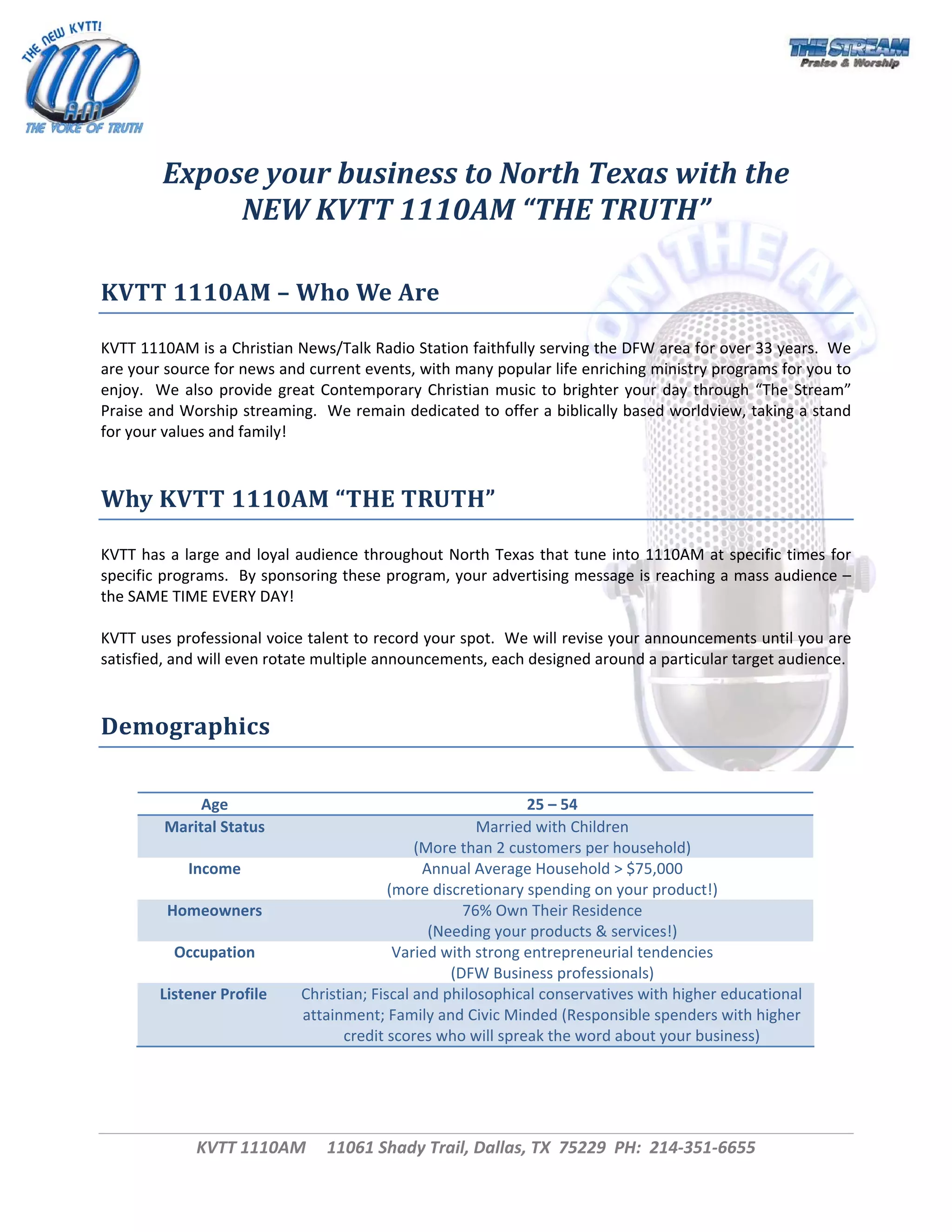 KVTT 1110AM is a Christian news/talk radio station in Dallas-Fort Worth that has served the area for over 33 years. It provides news, ministry programs, and contemporary Christian music. KVTT has a large, loyal audience that tunes in at specific times for specific programs, providing advertisers access to this consistent audience. Contemporary Christian radio in general is one of the fastest growing formats, appealing to families with its values-oriented content. Listeners tend to be married with children, educated, active in their communities, and loyal to advertisers on Christian radio stations. KVTT aims to vastly over-deliver value to its advertisers.