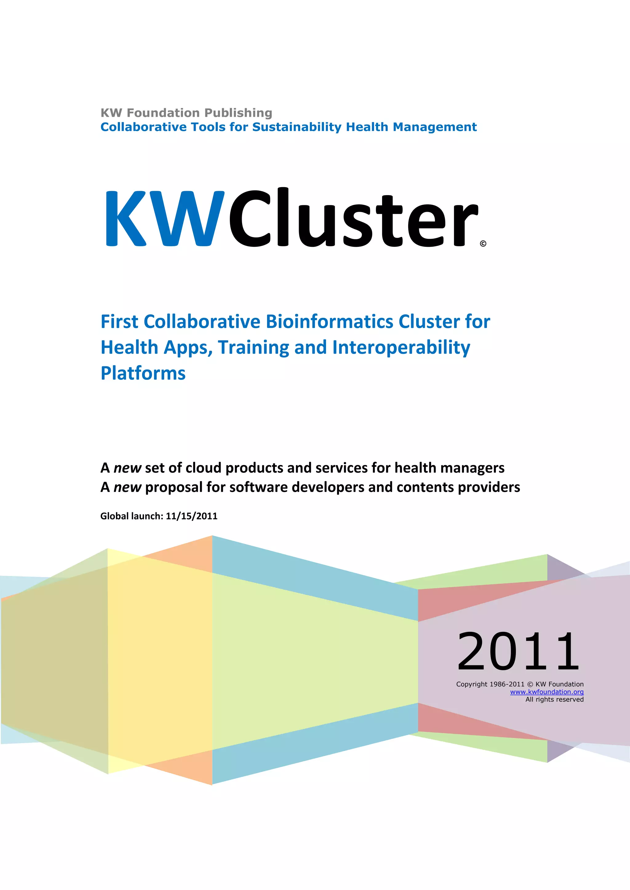 This document introduces the KWCluster, a first collaborative bioinformatics cluster for health apps, training, and interoperability platforms. It provides a new set of cloud products and services for health managers and a proposal for software developers and content providers. The global launch is scheduled for November 15, 2011. The KWCluster allows for the collaborative development of reusable knowledge objects like processes, forms, indicators, and medical records to increase sustainability in health management. It provides benefits like increased patient life expectancy, cost savings, and quality improvements for organizations that use knowledge-based systems.