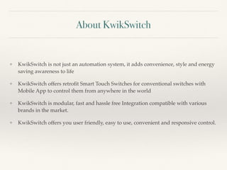 Kwikswitch is a retrofit smart touch switch system that allows users to control conventional switches via a mobile app without any changes to existing wiring, making it a convenient and energy-efficient home automation solution. It offers features such as single-touch control, user-friendly design, and the ability to integrate add-ons like motion sensors and LED controllers. The Kwikswitch system is compatible with various existing home automation systems and is installed using a DIY approach, usually completed within two working days for a typical two-bedroom apartment.