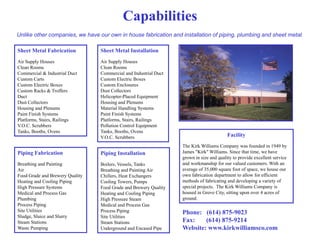 Kirk Williams Mechanical Services is a mechanical contractor located in Grove City, Ohio that has over 50 years of experience. They specialize in sheet metal fabrication, piping fabrication and installation, and HVAC services. They have an in-house fabrication department capable of custom projects. Their services include design, retrofits, shutdowns, fabrication, installation, and repairs for commercial and industrial clients.