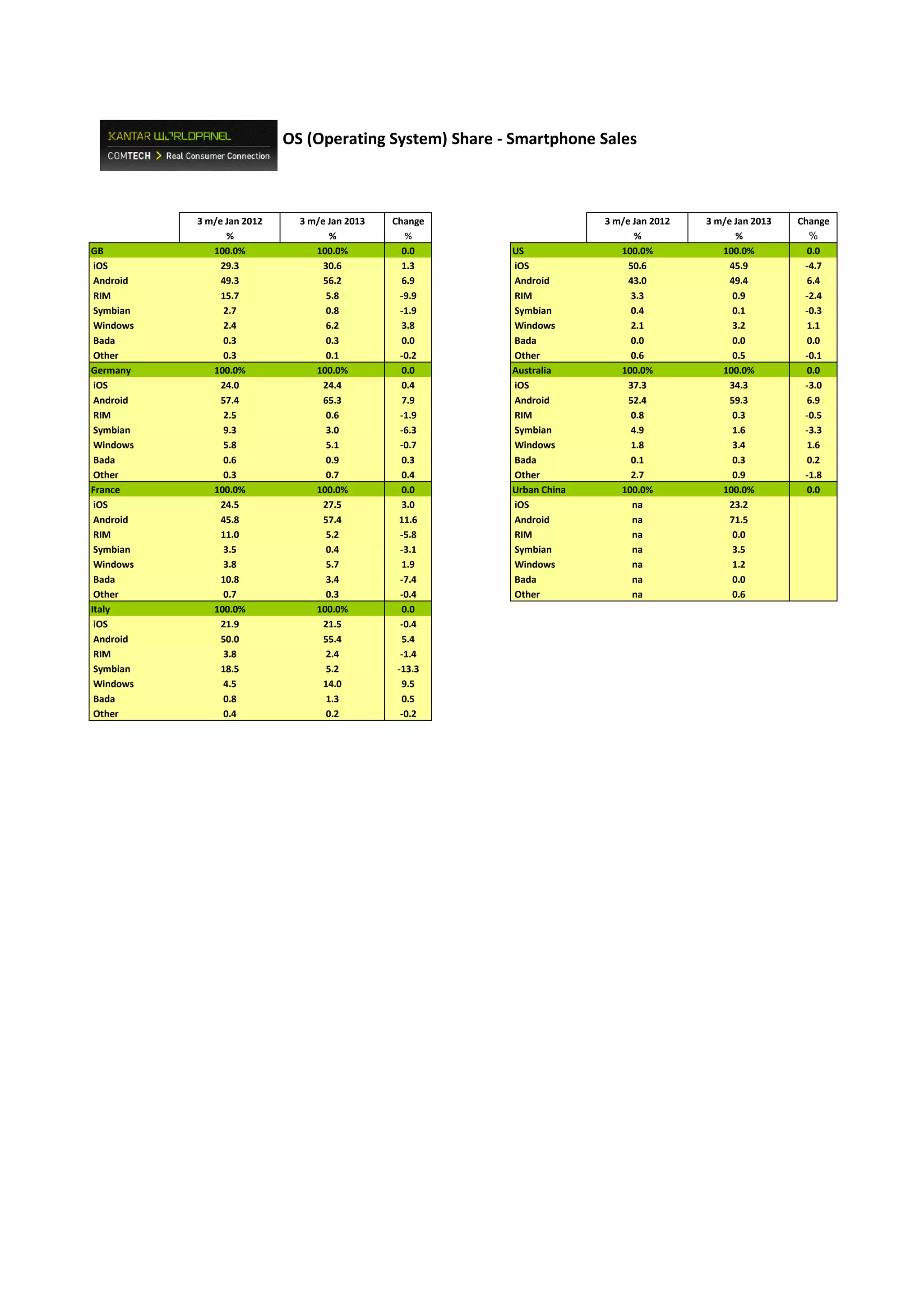 The document shows smartphone operating system market shares in several countries between January 2012 and January 2013. It found that Android grew significantly in most markets while Blackberry declined sharply. iOS increased its share in the US but lost share in some international markets as Android grew more popular globally.