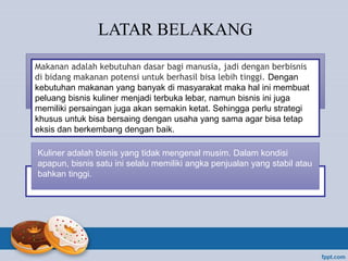 Dokumen ini membahas manajemen dan kewirausahaan dalam bisnis kuliner dengan fokus pada produk donat inovatif yang dapat menciptakan peluang usaha baru bagi mahasiswa. Strategi pemasaran melibatkan observasi pasar dan penggunaan media sosial untuk memperkenalkan produk. Analisis SWOT menunjukkan potensi keuntungan yang tinggi, tetapi juga menghadapi tantangan seperti kurangnya lokasi tetap.