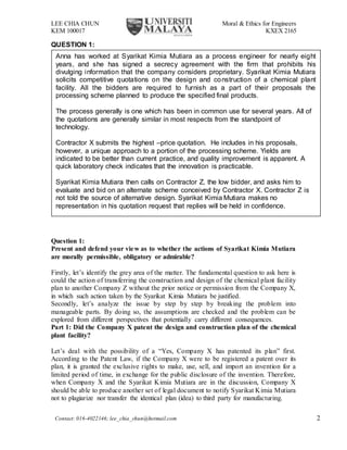 Syarikat Kimia Mutiara solicited bids for a chemical plant design project. Contractor X submitted the highest bid but included a unique processing scheme. Without informing Contractor X, Syarikat Kimia Mutiara asked Contractor Z to bid on Contractor X's scheme. This document discusses the ethics of Syarikat Kimia Mutiara's actions in three parts: it was unethical to transfer Contractor X's confidential information without permission, especially if Contractor X had patented the design; the action could harm relationships and reputation in the long run; and Anna, an employee of Syarikat Kimia Mutiara, should not have disclosed information to her boyfriend at Contractor X unless public