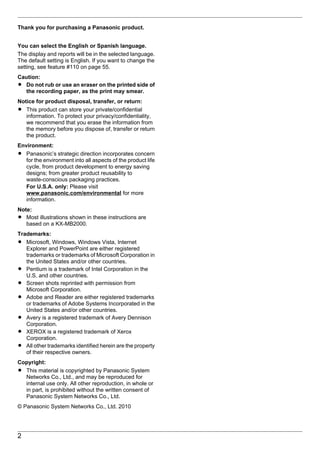 1. This document provides operating instructions for the Panasonic Multi-Function Printer KX-MB2000/KX-MB2010/KX-MB2030.