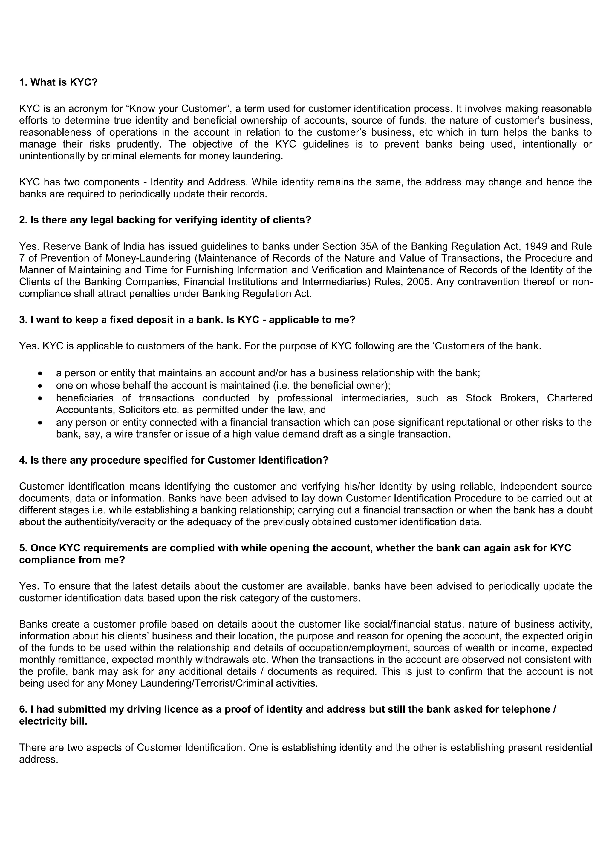KYC (Know Your Customer) is the process banks use to verify a customer's identity and assess potential risks of money laundering or terrorist financing. It involves customer identification, verifying their identity documents, gathering information about the nature and purpose of business relationships, and ongoing monitoring of transactions. Banks are legally required by RBI guidelines to follow KYC procedures to open accounts and comply with anti-money laundering laws. KYC applies to all bank customers, including those opening savings accounts or getting credit/debit cards. If a customer refuses to provide the necessary KYC information, the bank may close their account after notifying them.