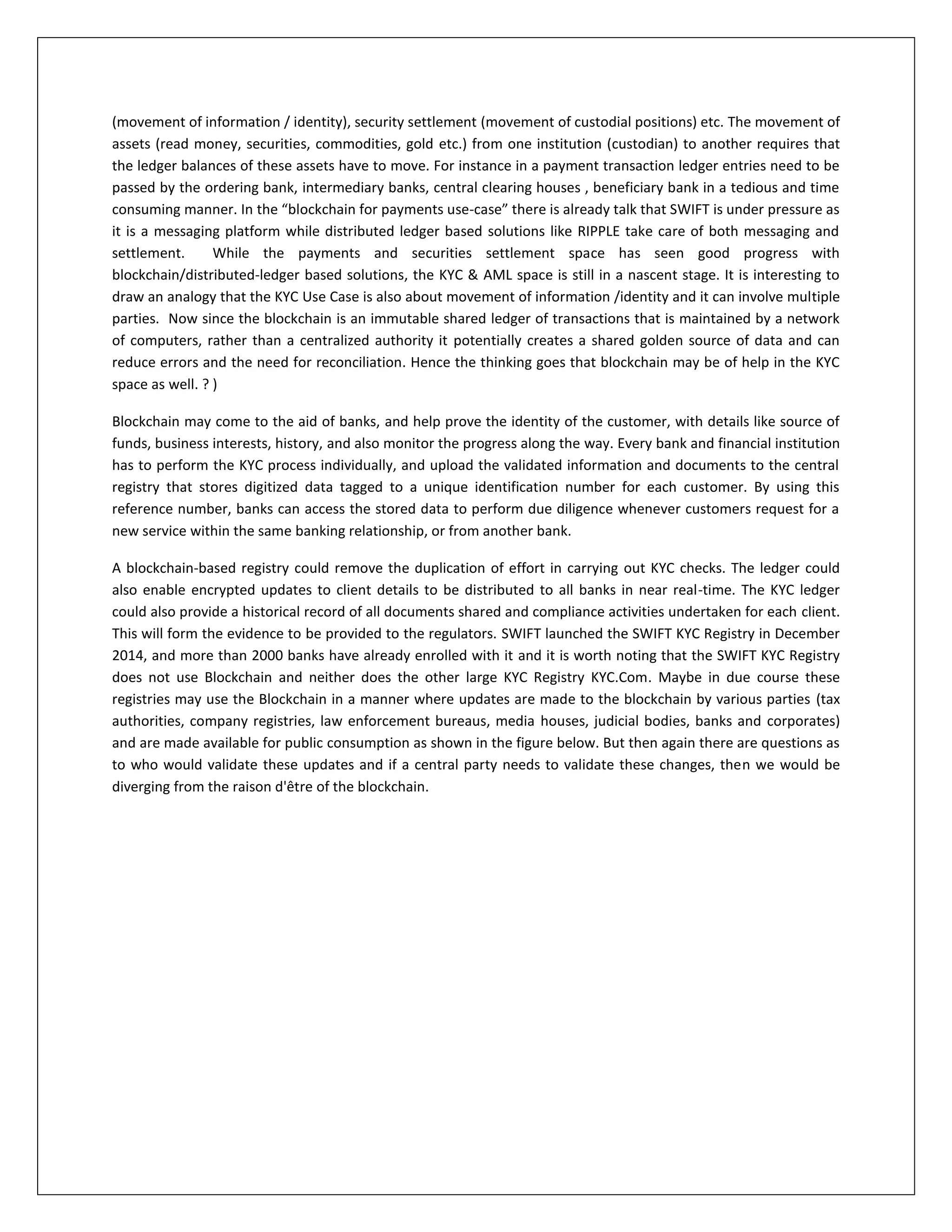 Blockchain has the potential to help solve banks' Know Your Customer (KYC) and anti-money laundering (AML) challenges by creating an immutable shared ledger for customer identity information. This could reduce duplication of KYC checks across banks and allow for real-time updates to customer details. However, key questions remain around who would validate updates to the ledger and whether a central party is still needed. A blockchain-based digital identity system may provide even greater benefits by allowing customers to submit documentation once and share identity details across industries, improving security, transparency and reducing costs for banks. Ultimately it is unclear how blockchain may evolve in solving KYC, whether as a single centralized registry, private blockchains, or a