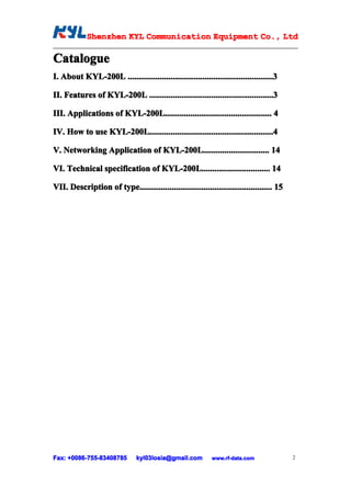 The document provides detailed information about the Kyl-200L low power wireless transceiver data module manufactured by Shenzhen Kyl Communication Equipment Co., Ltd, including its specifications, features, applications, and operational instructions. Key features include low power consumption, high transmission reliability, and various communication interfaces like RS-232 and RS-485. The module is suitable for numerous applications such as automatic meter reading, wireless alarm systems, and remote control systems.
