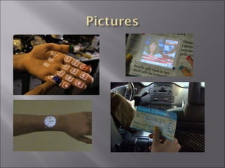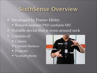 The document summarizes Pranav Mistry's SixthSense device, a wearable gestural interface consisting of a camera, colored markers, and projector worn around the neck along with a smartphone. The camera tracks the movement of the colored markers using algorithms to recognize hand gestures. The projector then projects stored data or applications onto surfaces based on the gestures. Some examples of gestures include taking a photo by making a frame with hands or projecting a digital clock by drawing a circle on the wrist. Potential applications include use in medical procedures or rehabilitation techniques.